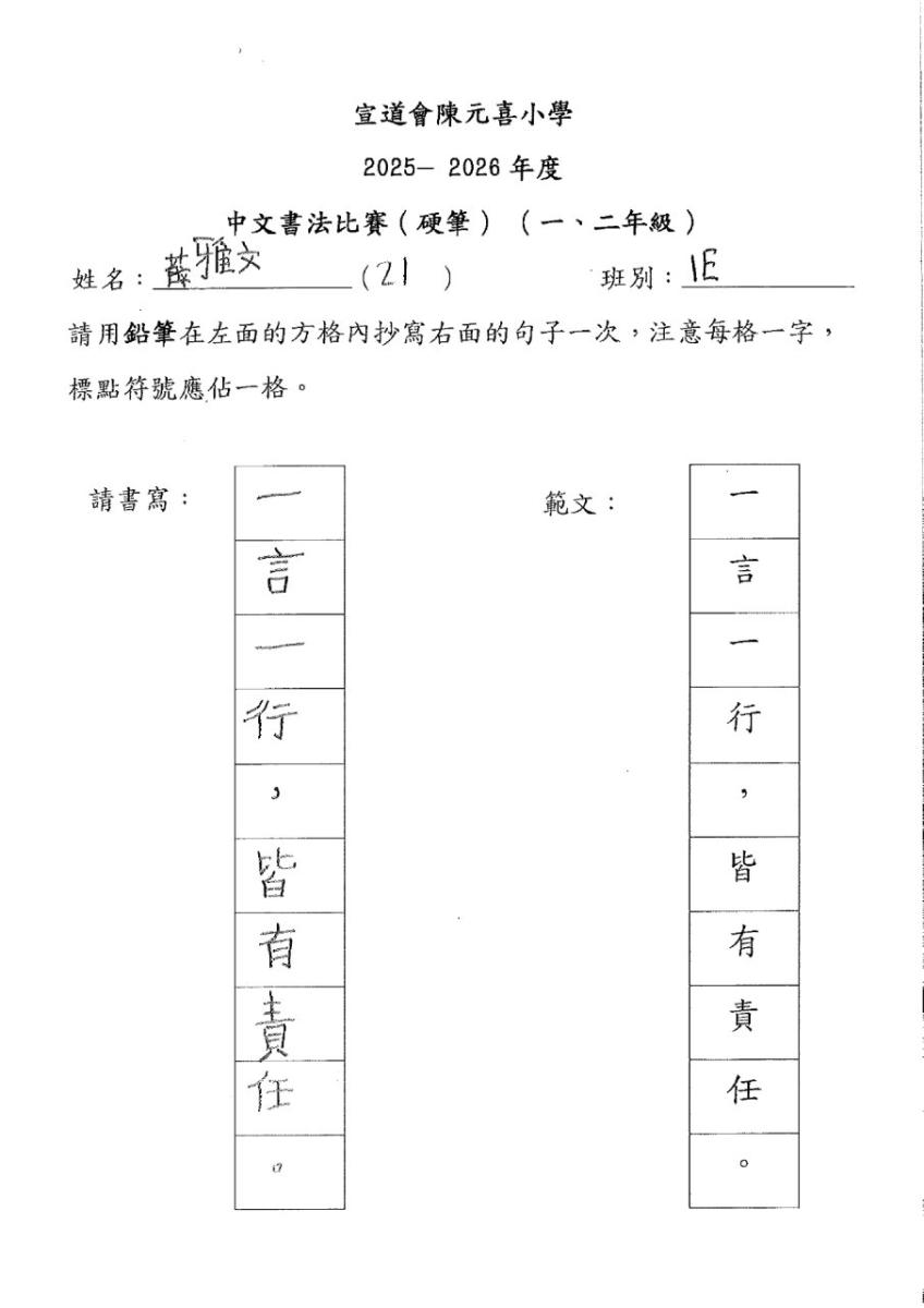 | 一年級 | 冠軍 | 1E | 薛雅文 | 下載 |